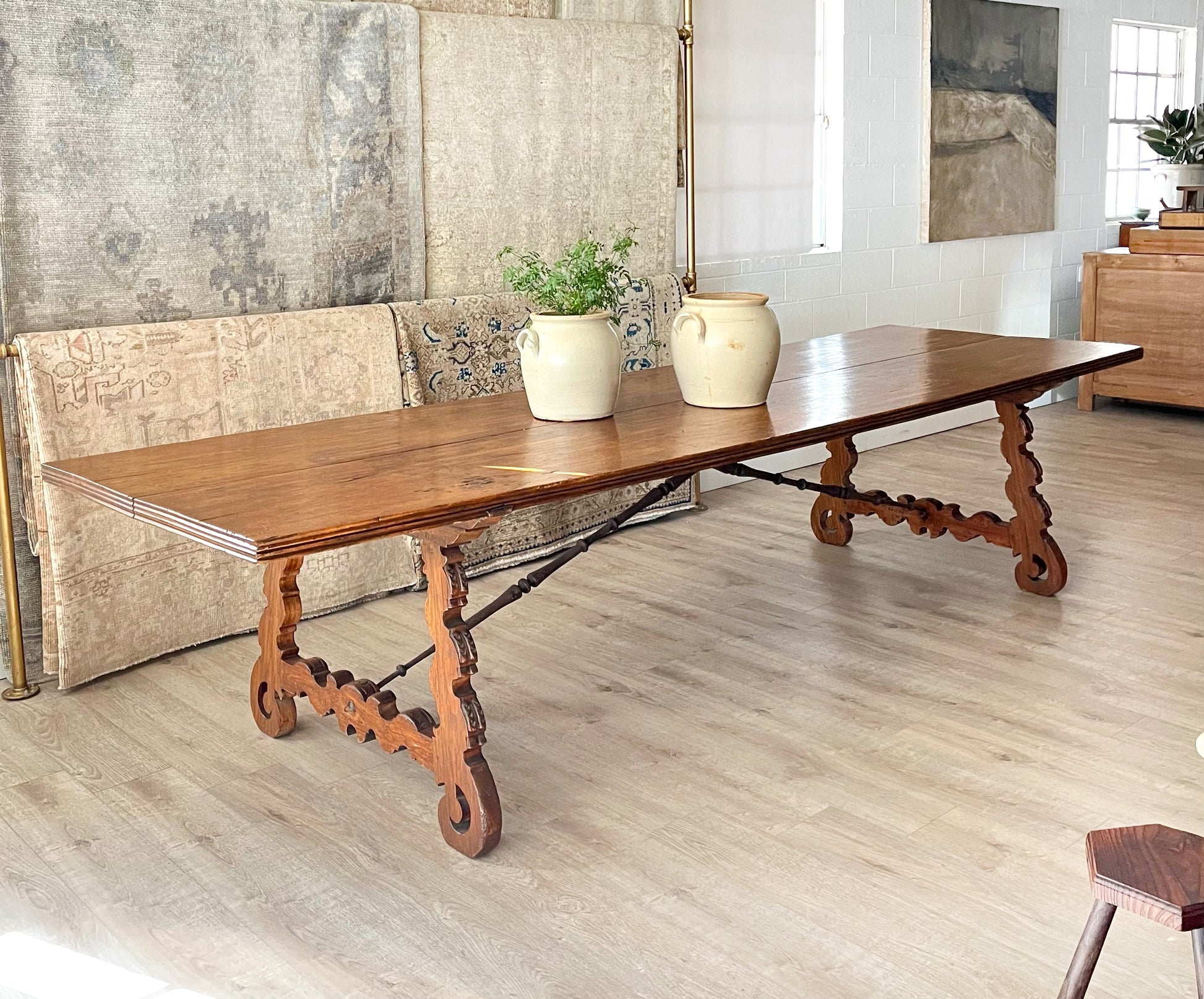 An exceptional 18th-century Baroque refectory table, once used in monastery dining halls where monks would gather for shared meals. Crafted over 200 years ago, it features a long, narrow top with beautifully aged wood, supported by carved trestle legs and a sturdy stretcher base. The scale, craftsmanship, and patina speak to its history, a true heirloom piece.