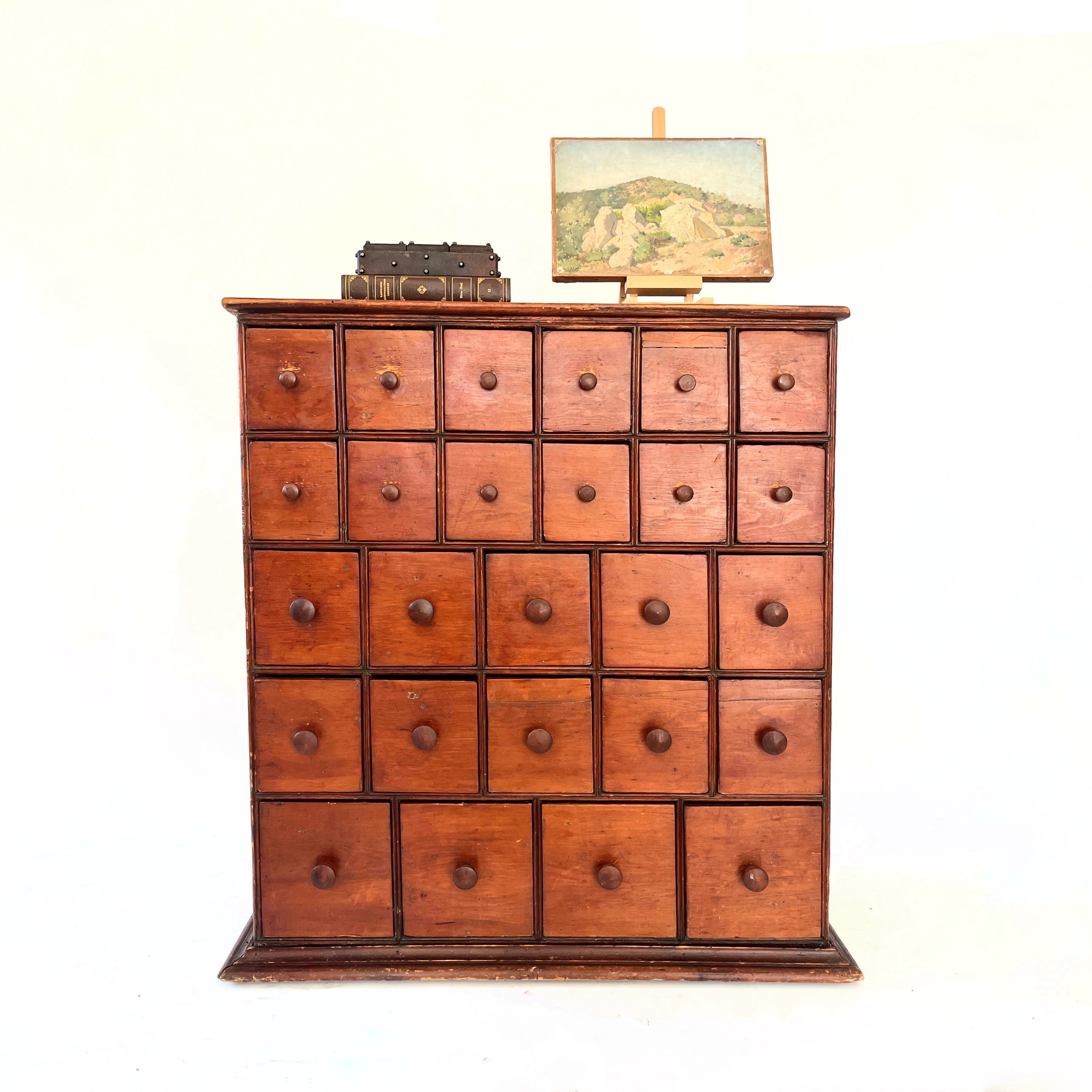 An early American apothecary cabinet crafted from solid wood with a rich, timeworn patina. Features a grid of hand-fitted drawers with original turned wooden knobs and traditional dovetail joinery. Subtle wear, softened edges, and tonal variation reflect decades of use and add to its character.