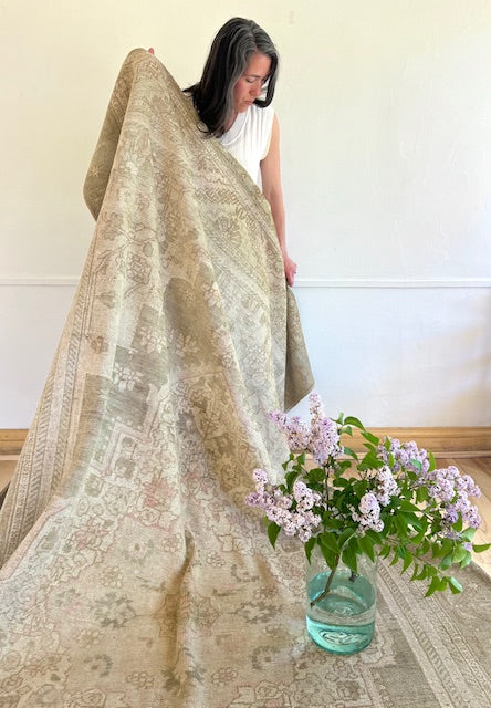 These antique vintage rugs have areas of wear and repairs and I love the stories behind every imperfection. Many rugs do not have straight lines because they are all handmade and one of a kind.