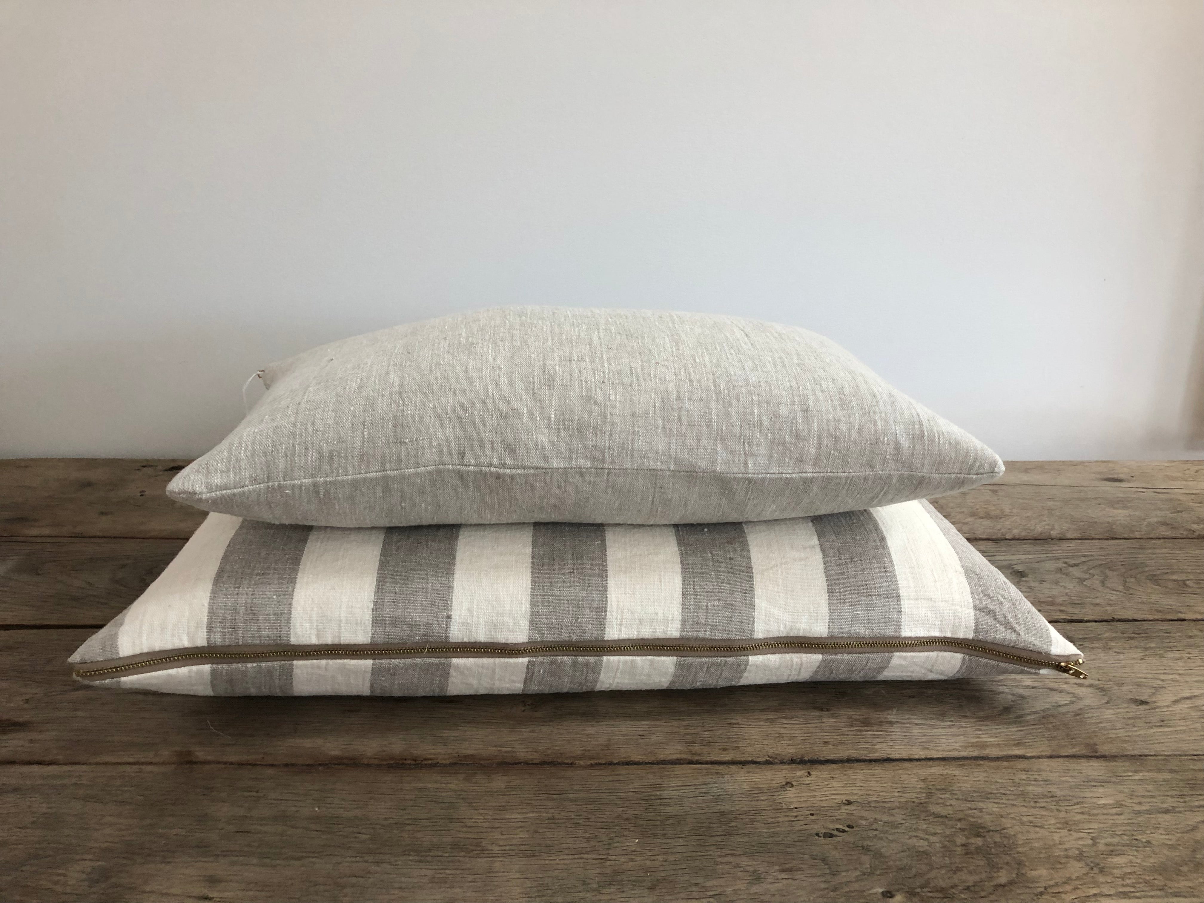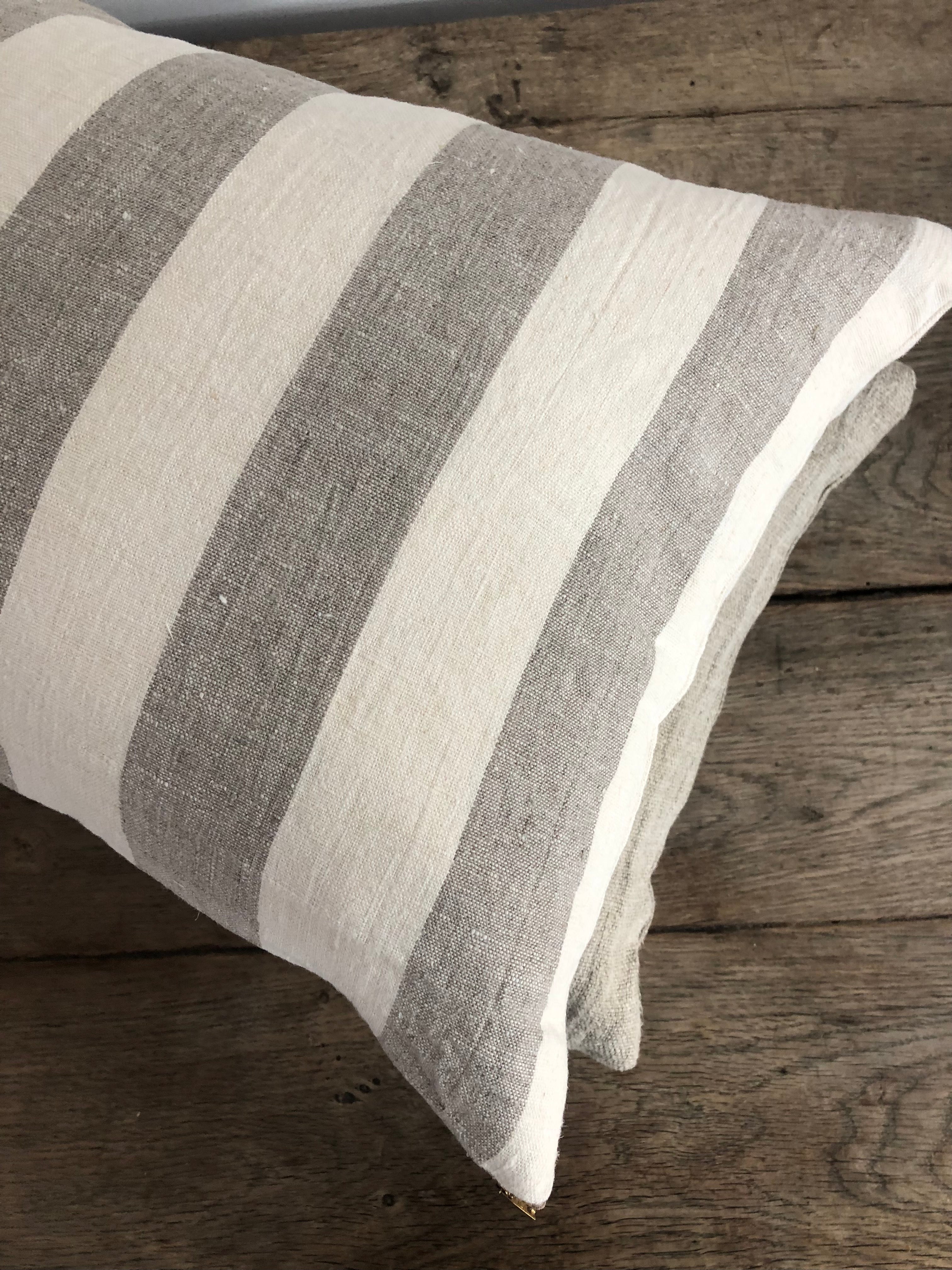 100% European linen creme and taupe big stripe pillow.