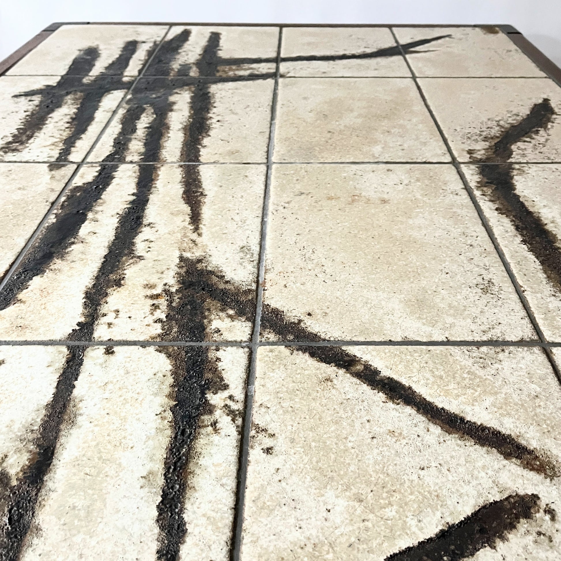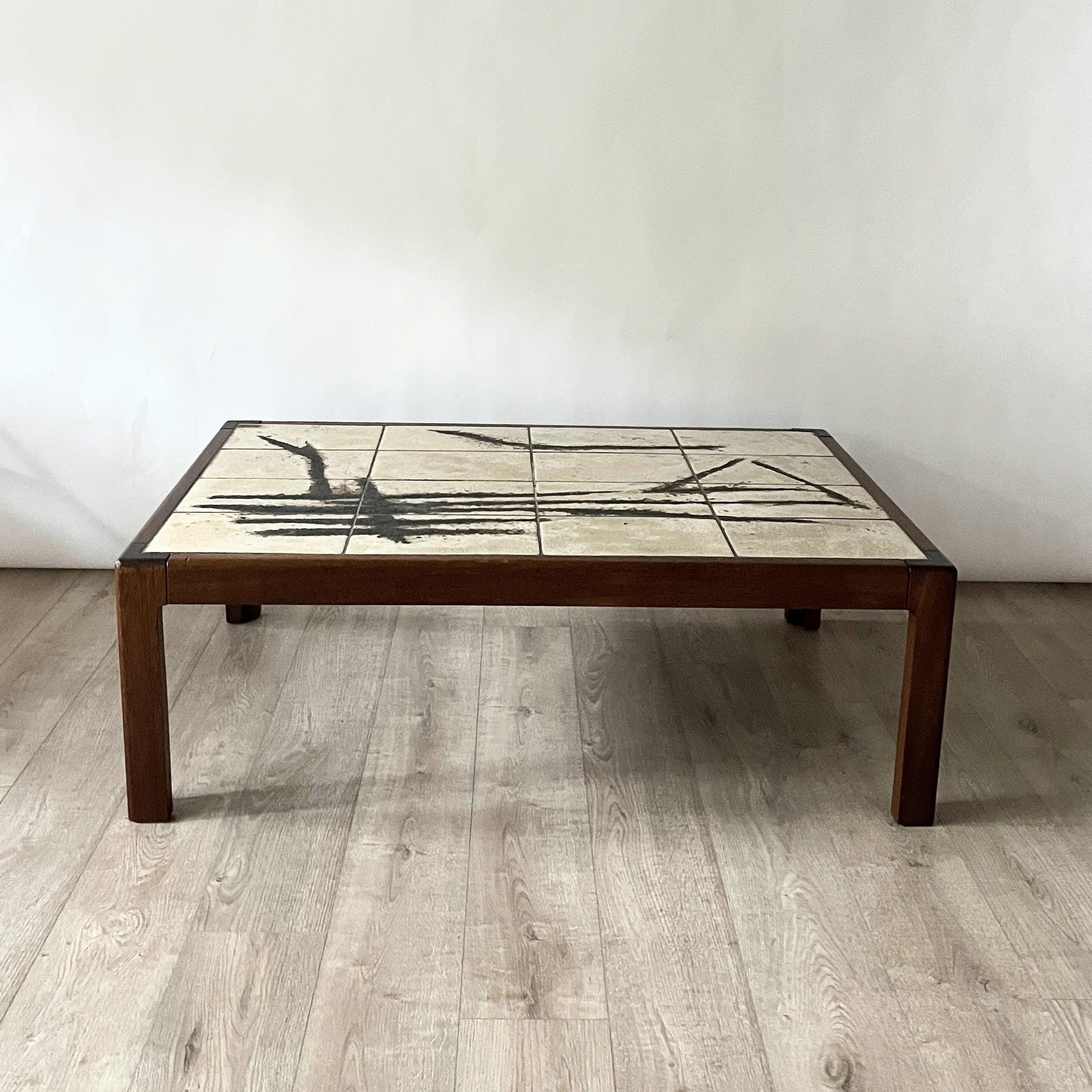 A striking example of mid-century Danish design, this vintage coffee table pairs clean, minimal lines with bold artistry. The top is inlaid with hand-glazed ceramic tiles in an abstract composition—organic and expressive, with deep inky strokes across a warm, sand-colored ground. The sturdy frame is crafted from solid wood, offering a rich contrast to the tiled surface and grounding the piece with warmth and timeless appeal. A functional statement piece that brings both utility and artistic character to a space.