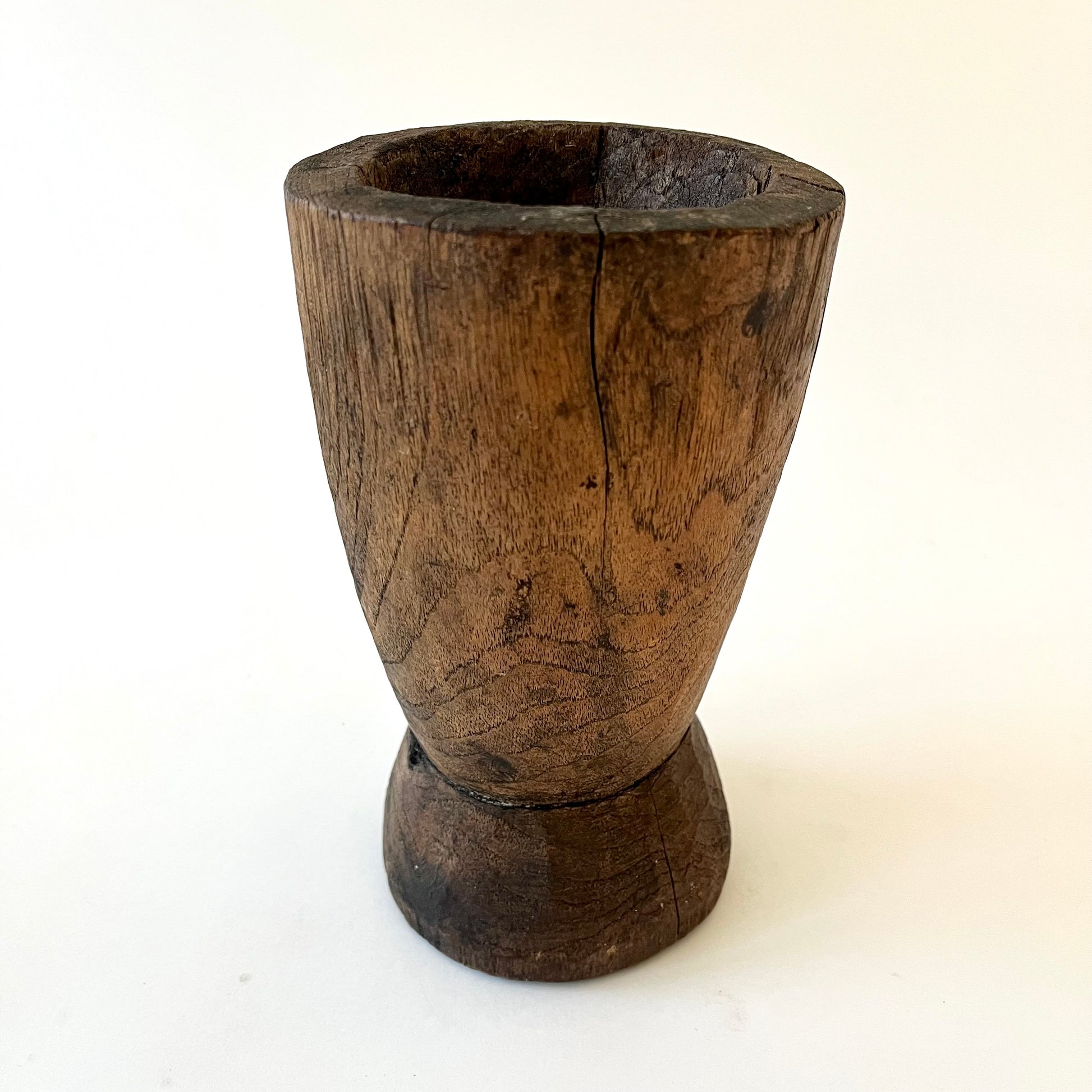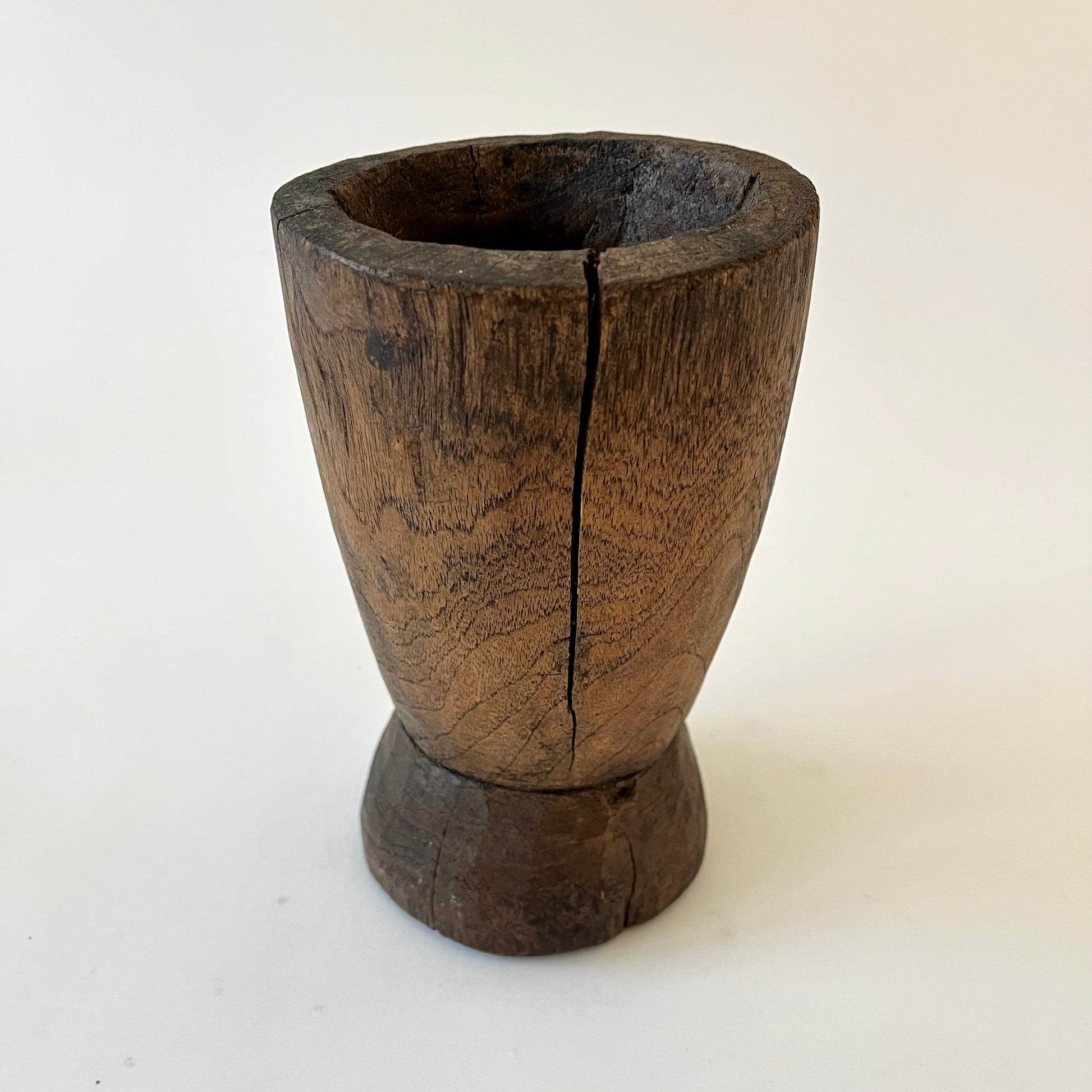 A beautifully worn, hand-carved wooden mortar with rich texture and an organic, time-earned patina. Cracked and weathered in all the right ways, it serves as both a piece of history and a sculptural object.