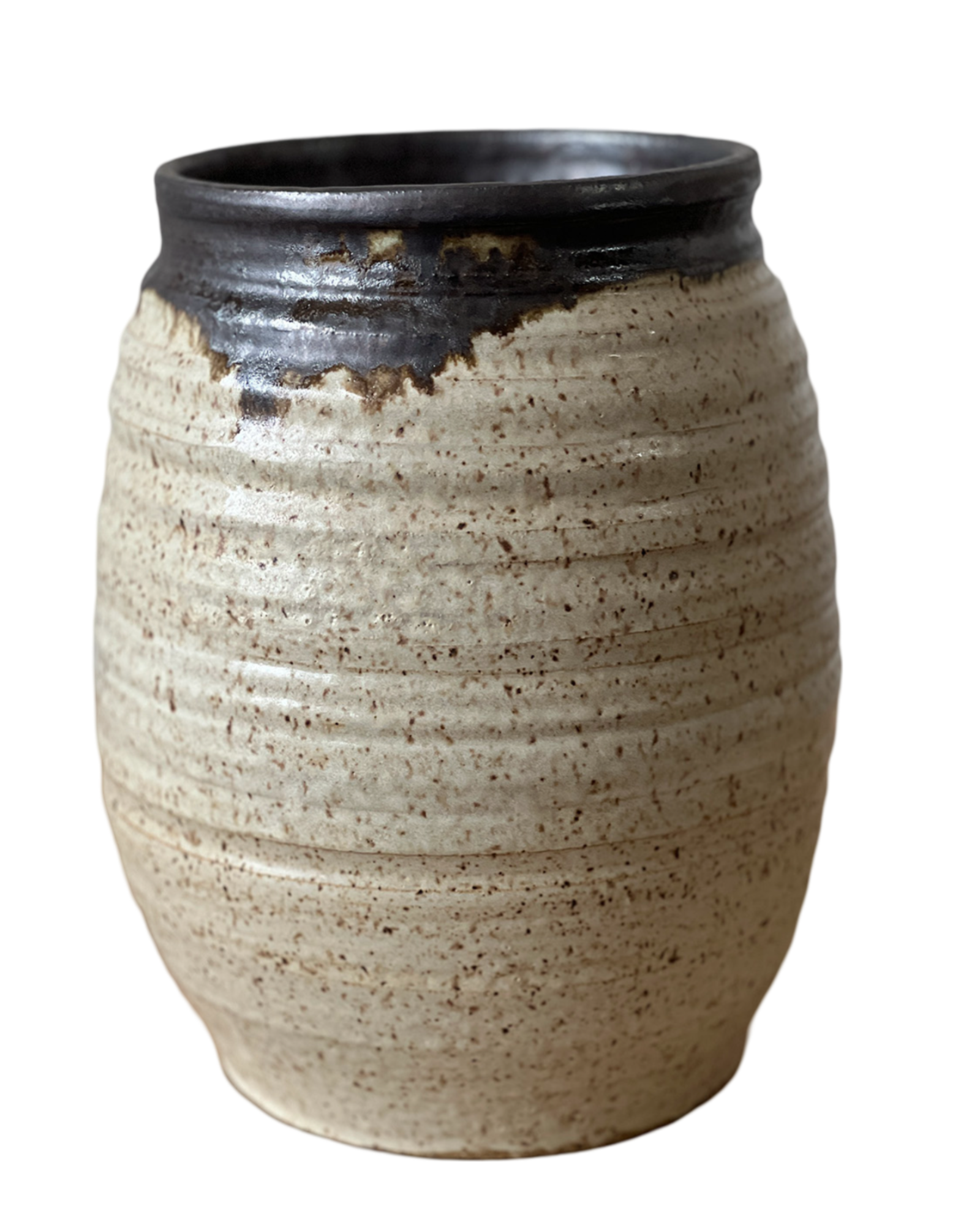 The body is glazed in a speckled, matte cream with subtle ridging from the wheel-throwing process, giving it a tactile, organic feel. A deep, glossy espresso glaze drips fluidly from the rim, creating a beautiful contrast and highlighting the artisanal nature of the piece.