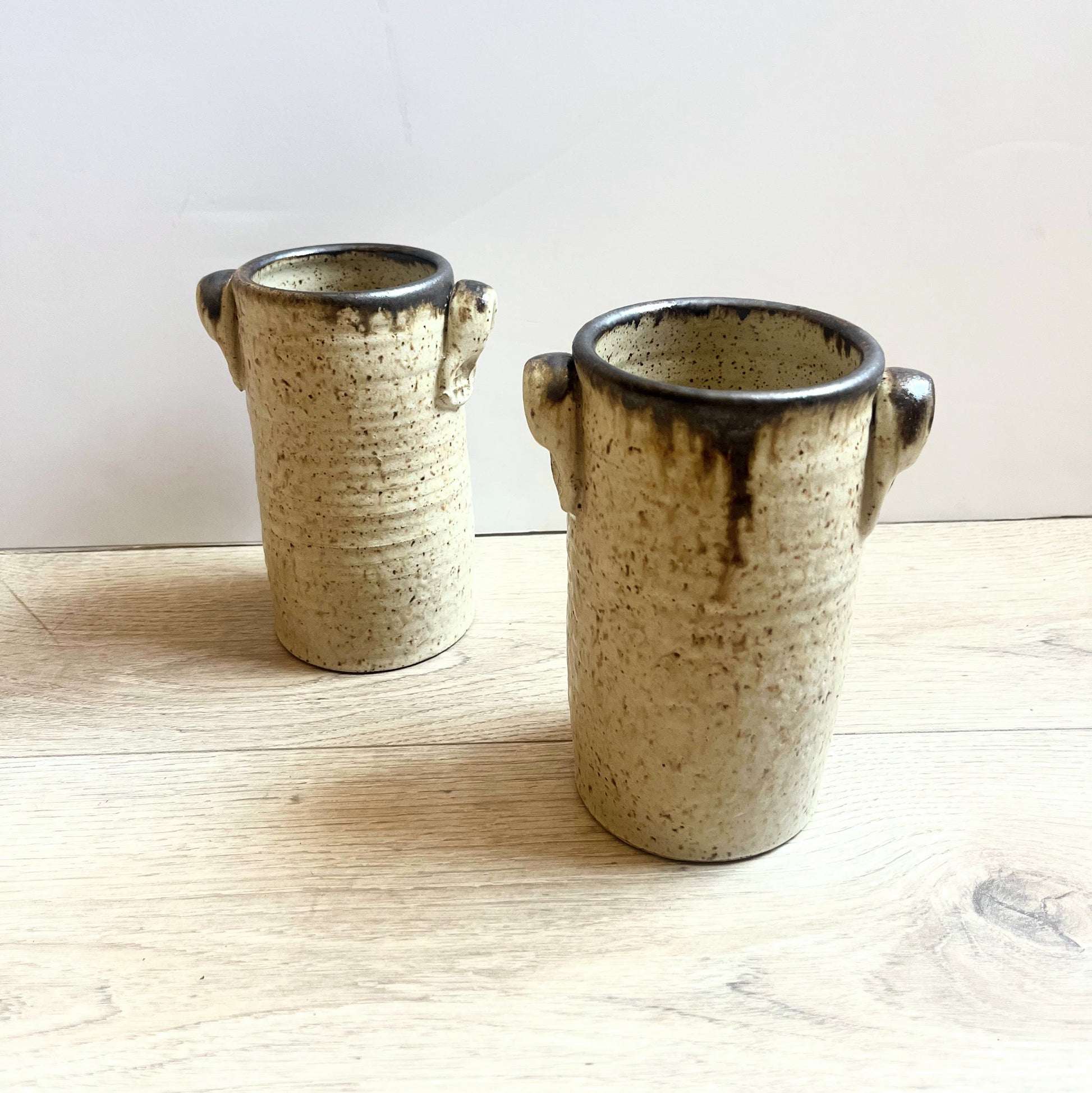 This wheel-thrown stoneware vessel has a gently tapered silhouette and subtle ribbed detailing that brings a sense of movement and texture. Finished in a soft, speckled matte glaze, its neutral palette and organic form lend effortless versatility. Whether used as a vase for fresh or dried stems, a utensil holder, or a sculptural accent, it adds warmth and quiet beauty to any space.