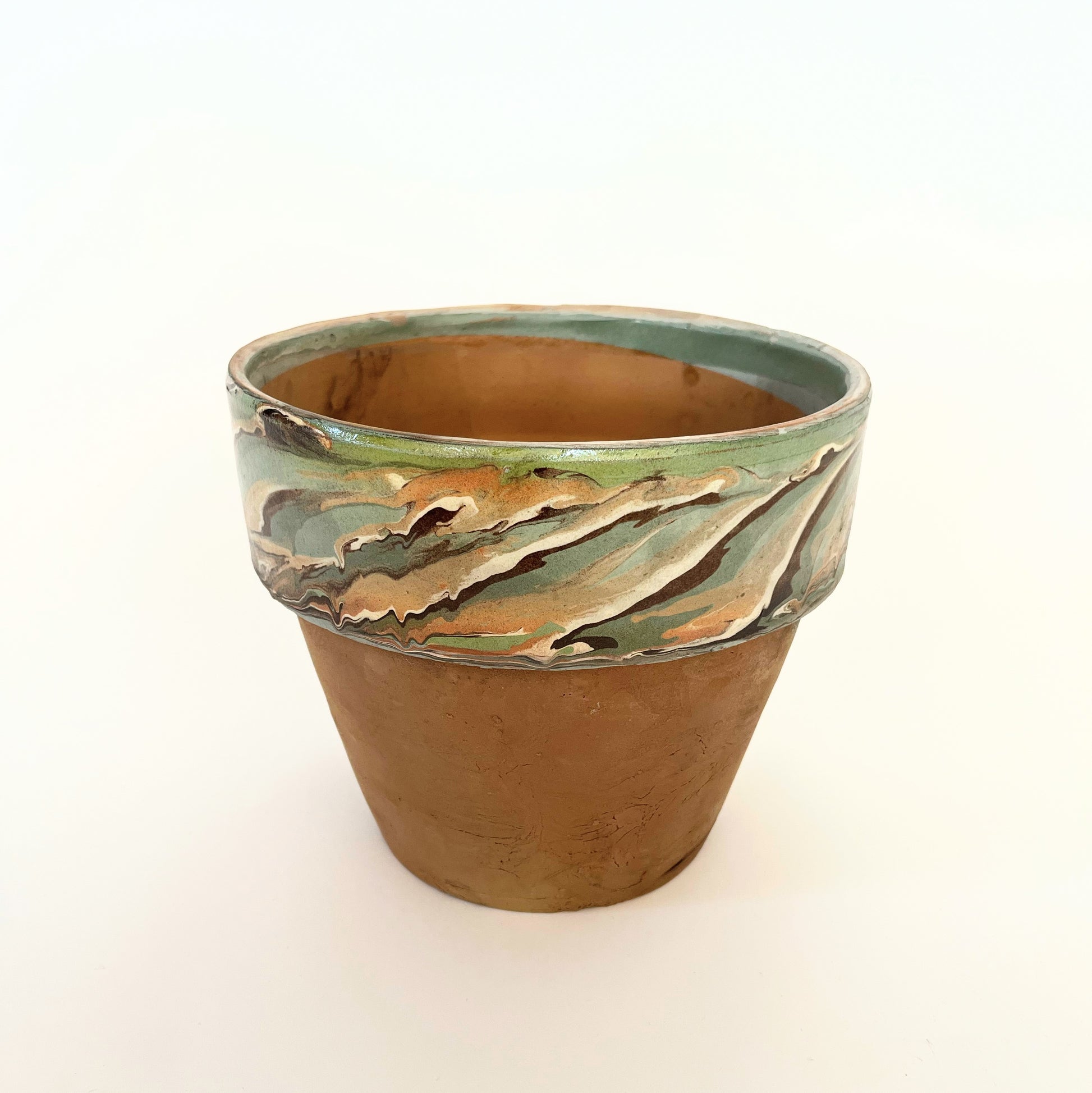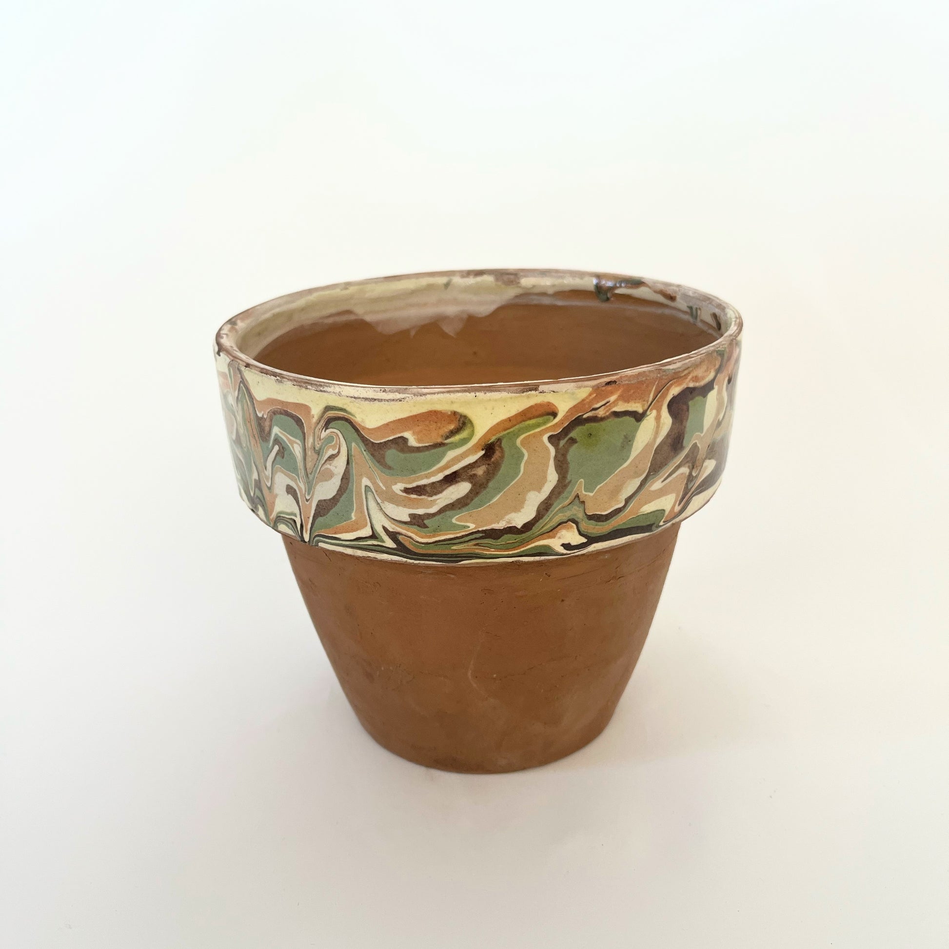Vintage hand-marbled terracotta pot from Hungary. Made using a traditional floating paint technique, each piece features a unique swirl pattern in green or beige glaze. Moderate wear consistent with age and use.