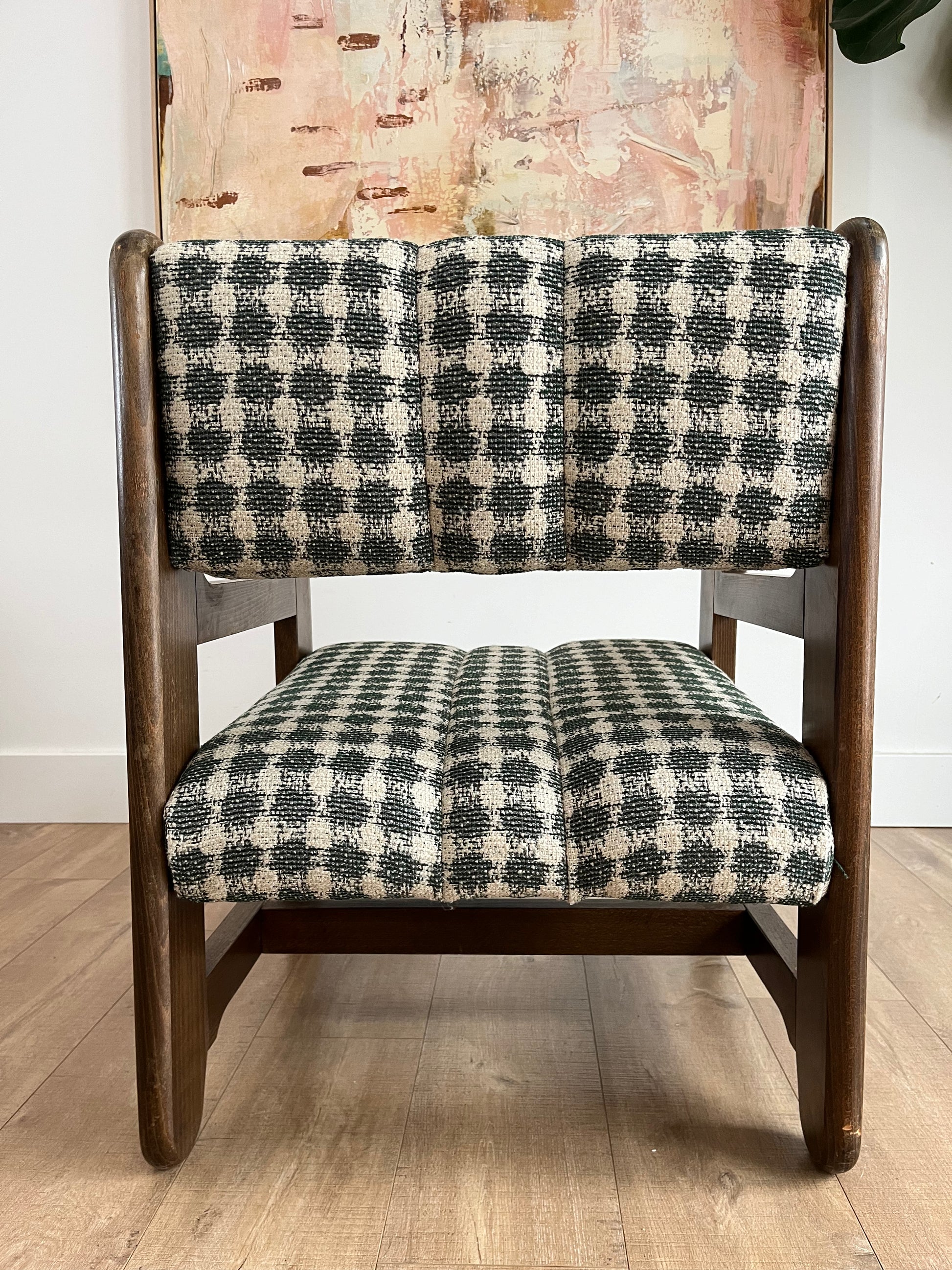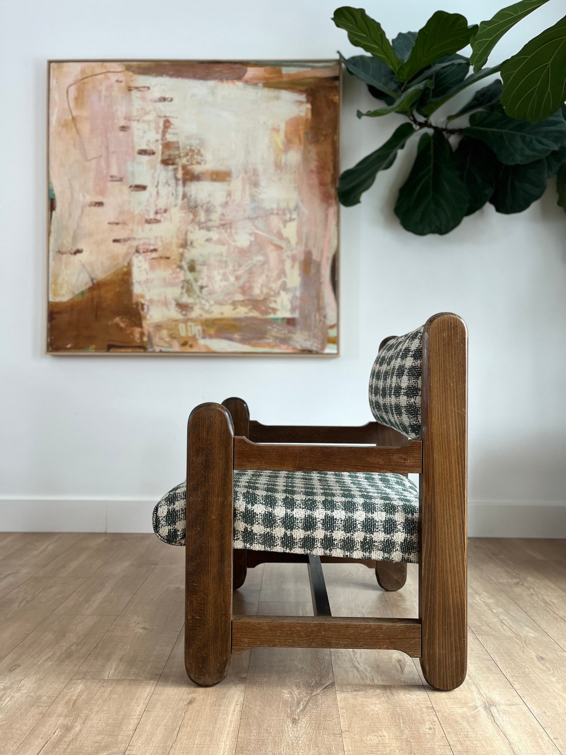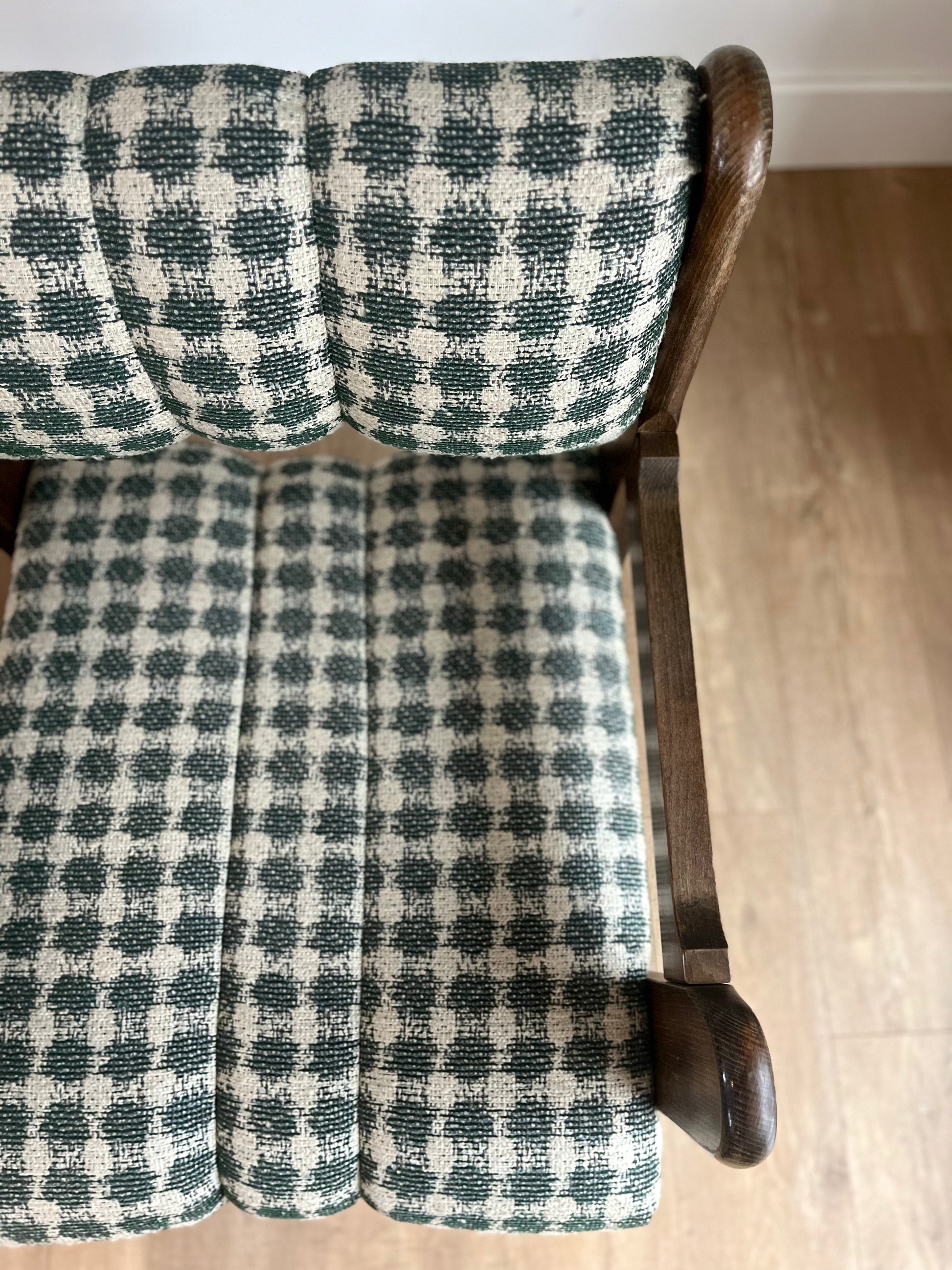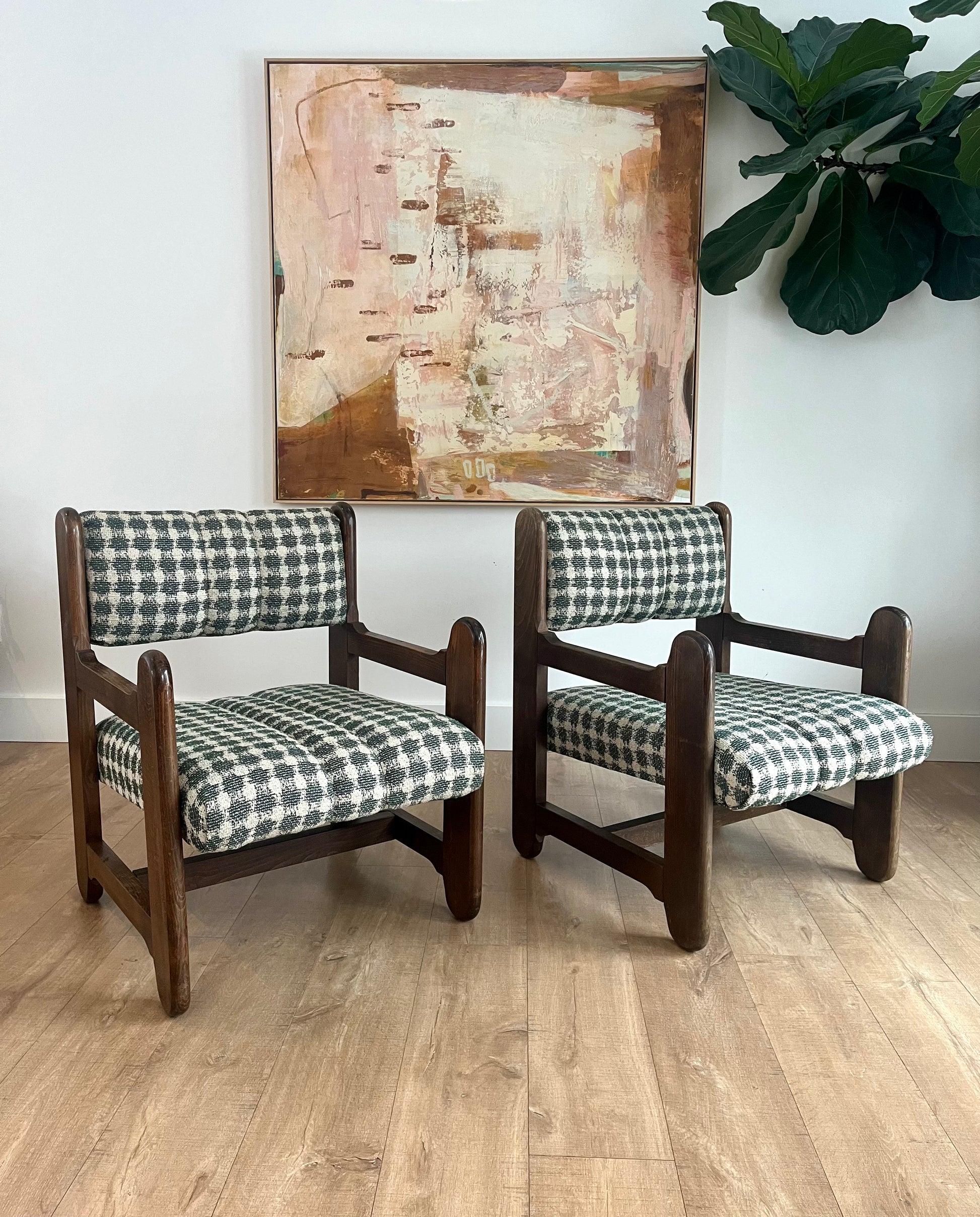 A pair of chairs with stories in their bones—crafted in Czechoslovakia, their solid wood frames carry the patina of time, softened by hands that have pulled them close for conversation, for rest, for quiet moments by the window. Their bold, sculptural lines ground them in history, while fresh upholstery in a Lorenzo Castillo houndstooth weave breathes new life into their form—classic yet unexpected.