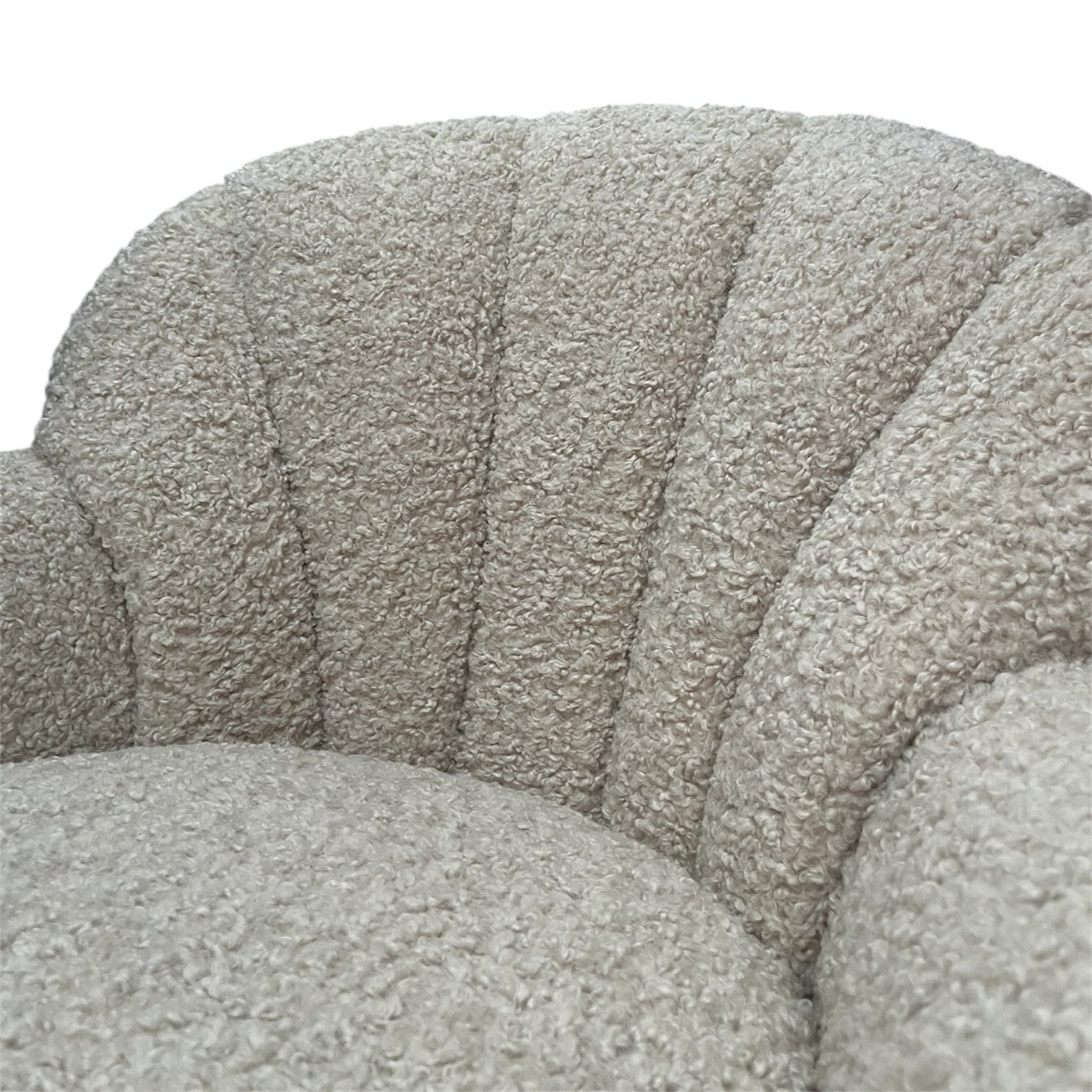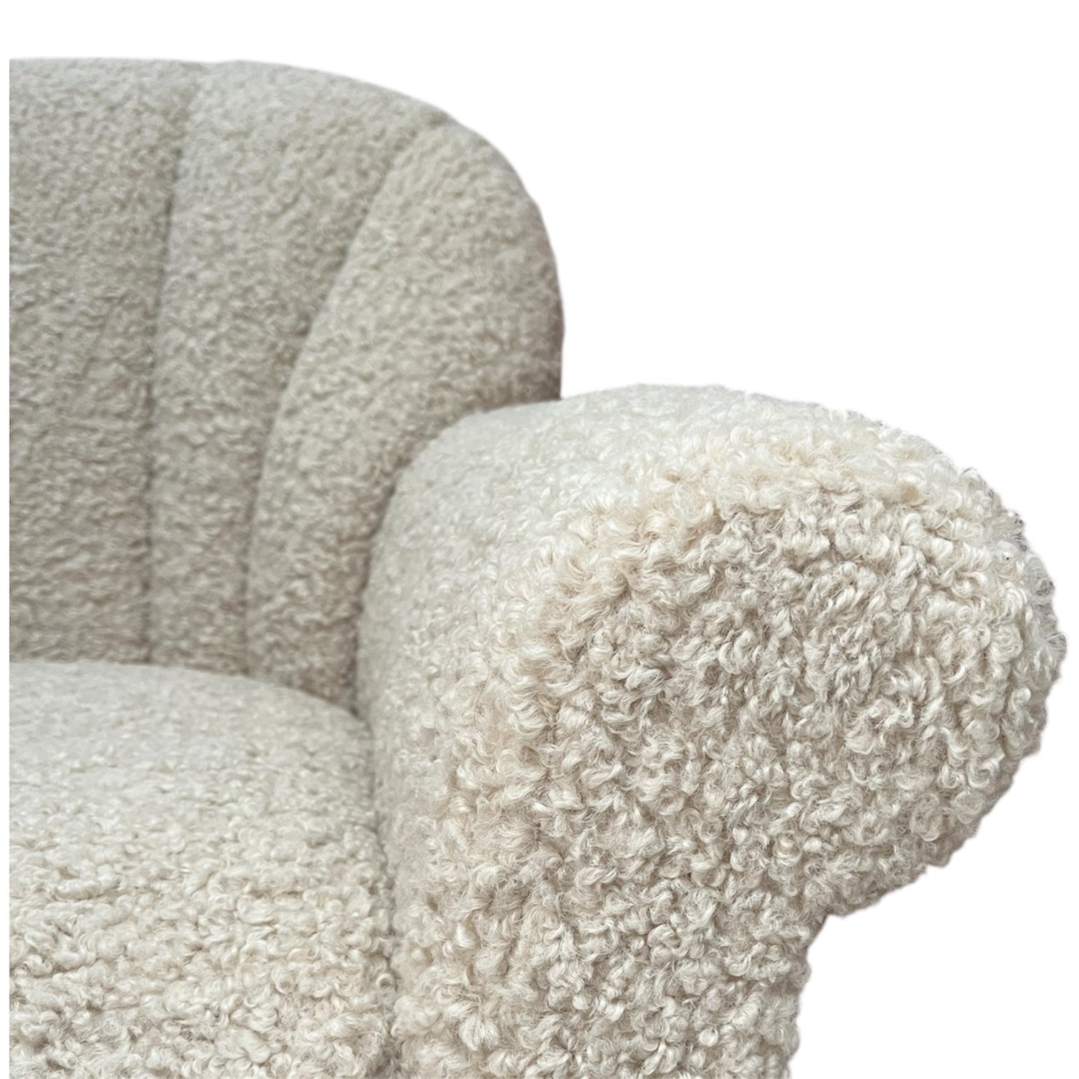 A sculptural pair of vintage club chairs newly reupholstered to highlight both comfort and texture. The front is upholstered in a soft, ivory sherpa with a plush, inviting hand, while the back is finished in a contrasting woven fabric that adds depth and visual interest. The curved arms and gently scalloped back give these chairs a timeless silhouette with a relaxed, modern feel.