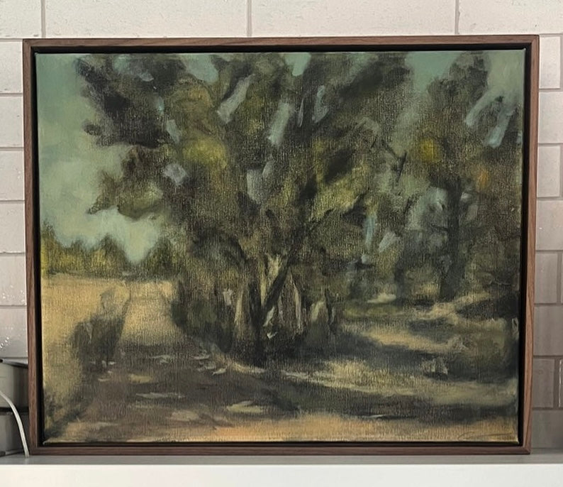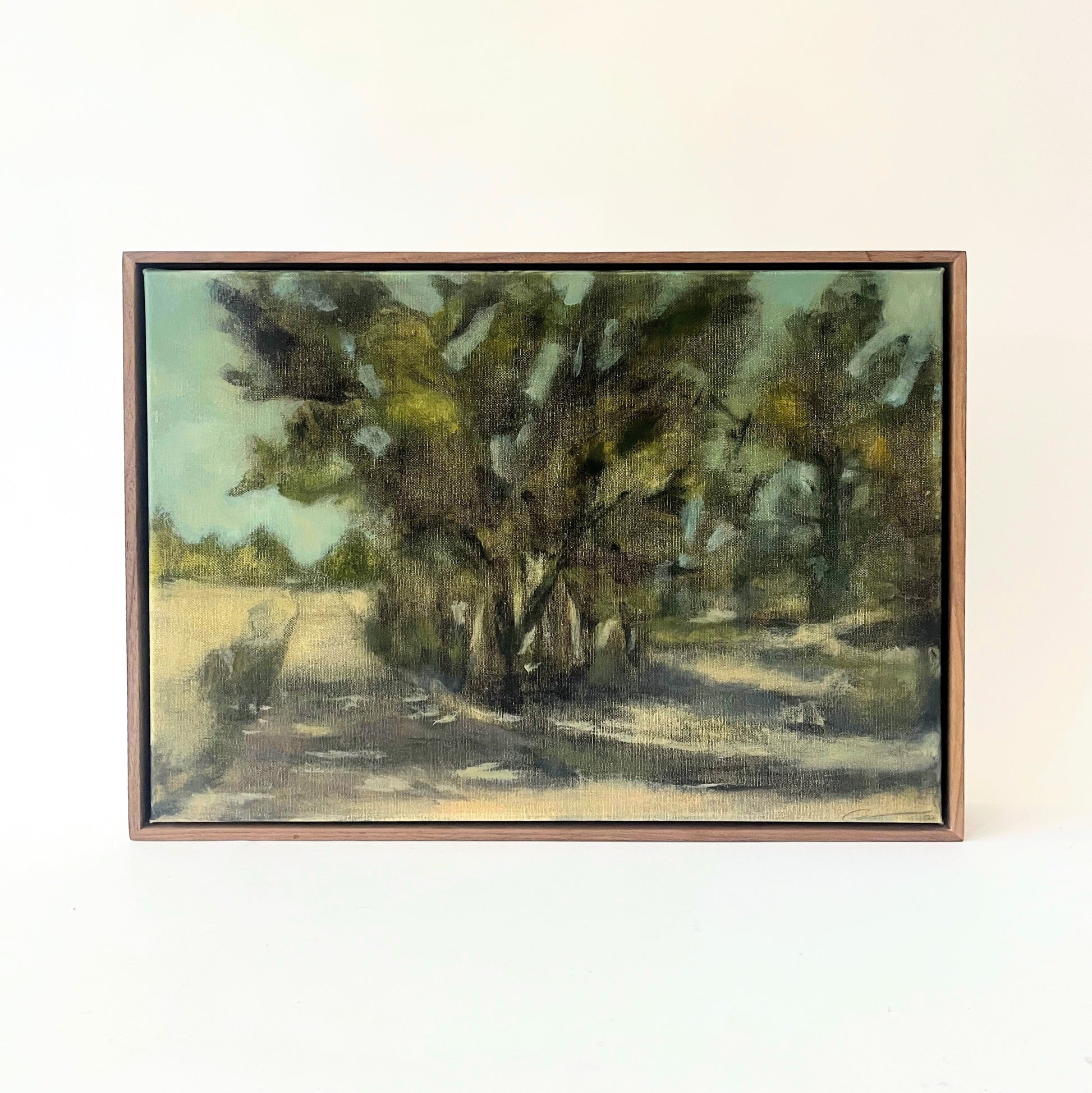 This atmospheric landscape painting captures a grove of trees bathed in soft, dappled light. Rendered in a muted, earthy palette, the brushwork is loose and impressionistic, giving the piece a dreamlike, timeless quality. The natural textures of the canvas subtly show through, enhancing its vintage charm.