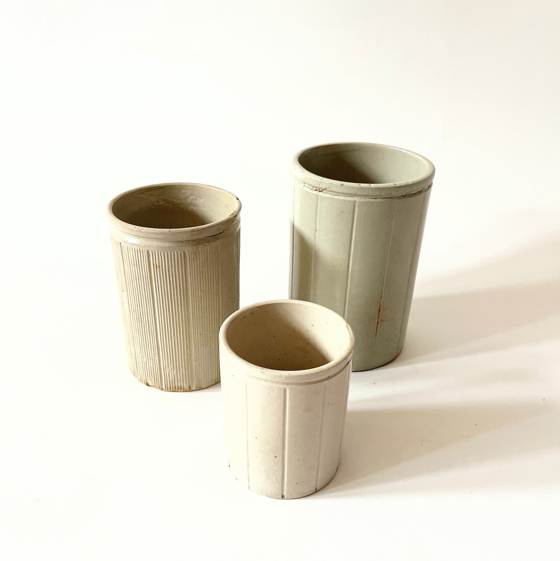 This is a Victorian-era stoneware marmalade jar, likely dating from the late 19th to early 20th century. The cylindrical form features a subtly fluted or paneled design along the sides, giving it a refined yet utilitarian appearance typical of domestic wares from the period. The jar is finished in a pale grey glaze with minor imperfections and surface crazing, consistent with age and use. Slight discoloration and wear near the rim and base add to its antique character. Originally used for preserving marmalade or other preserves, this charming piece now makes an excellent vessel for utensils, flowers, or display in a rustic or traditional kitchen.