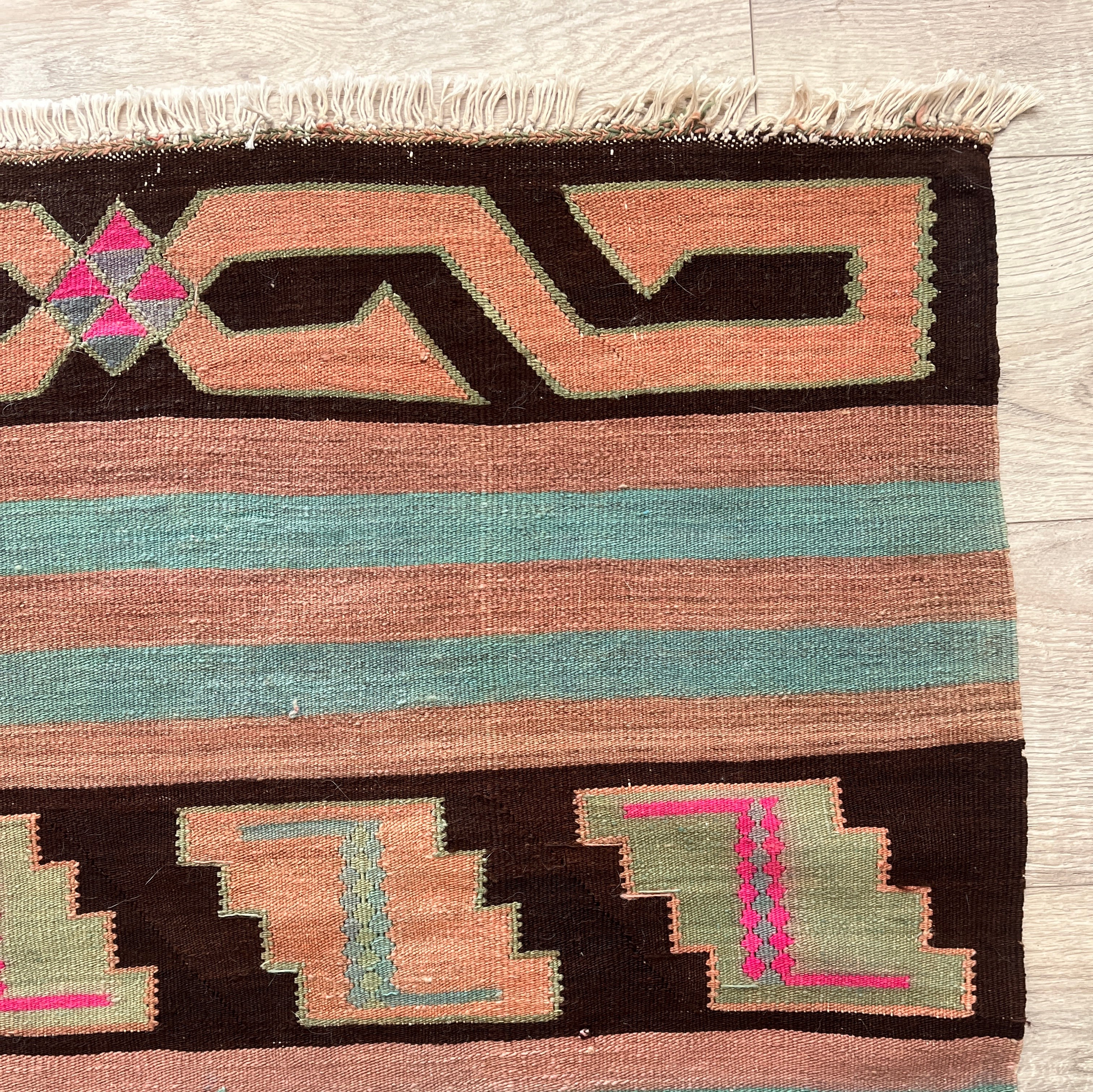 A handwoven wool kilim from Afghanistan, dating to the 1970s. This vintage piece features bold geometric stripes in warm tones of brown, peach, and sage. Woven entirely from wool with a durable flat-weave construction, it reflects the craftsmanship and style of mid-century Afghan textiles.