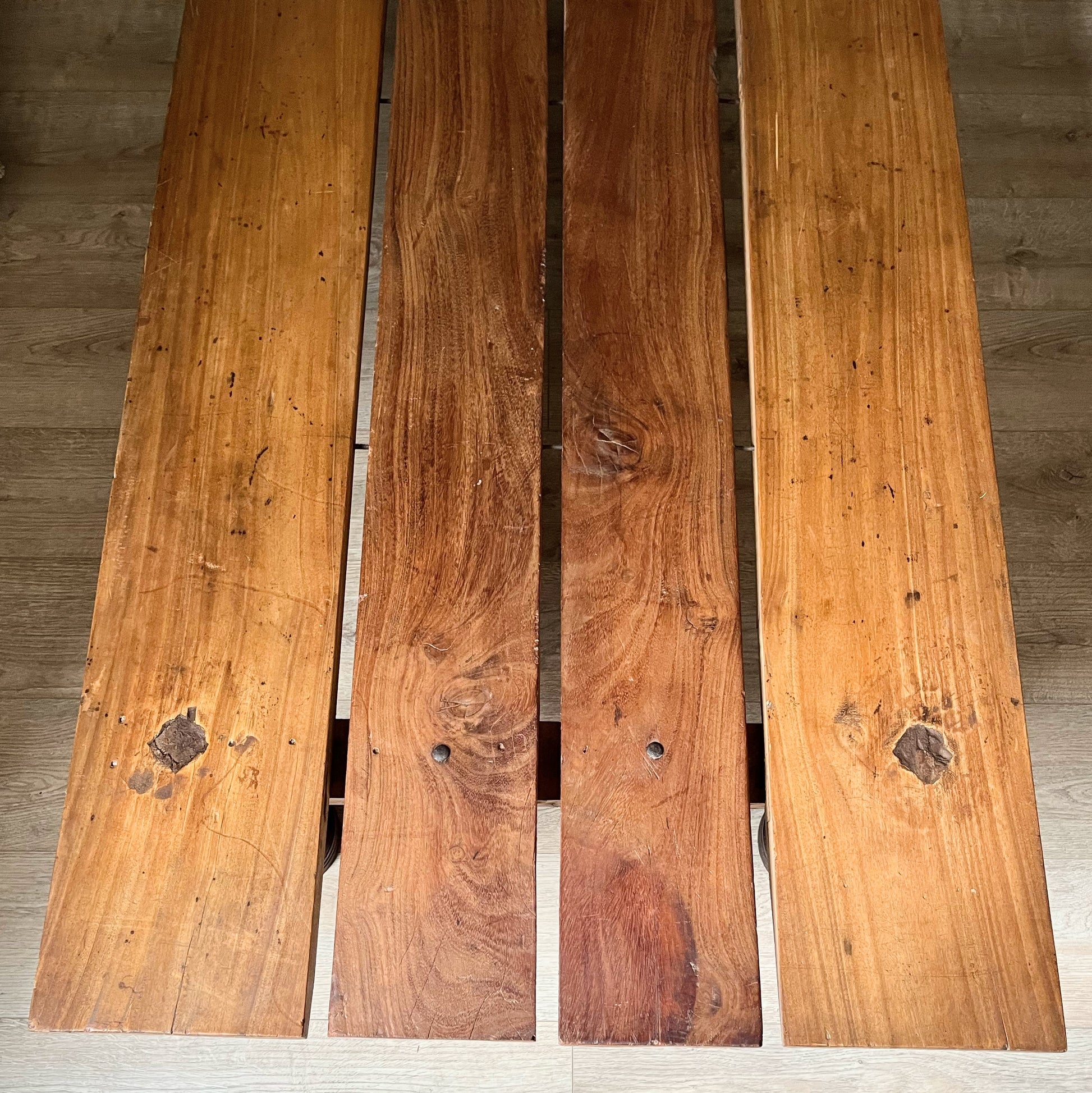 A vintage wood table with a plank-style top and beautifully turned legs. The surface shows natural knots, grain variation, and a warm patina, while the sculptural legs add charm and character. Perfect as a coffee table or low display piece.