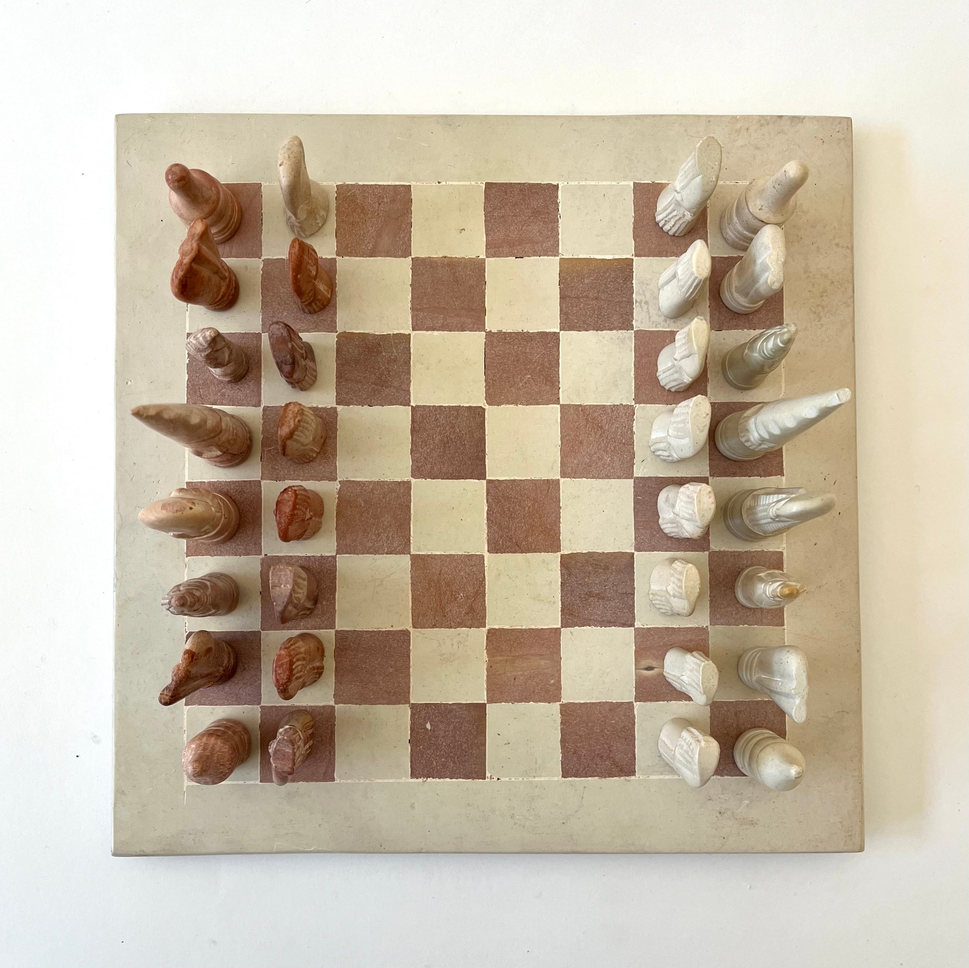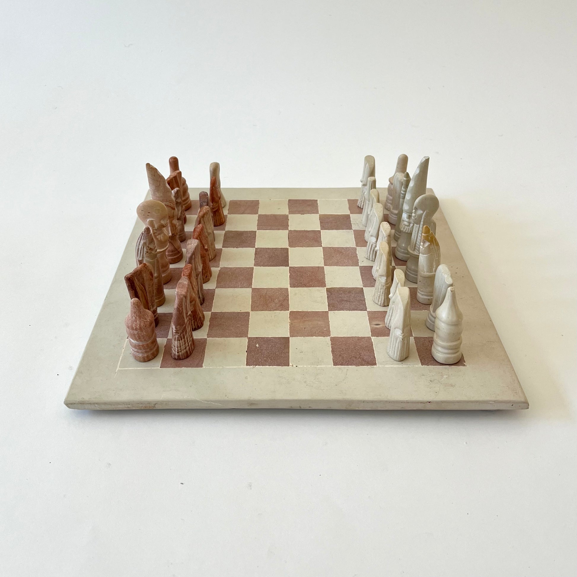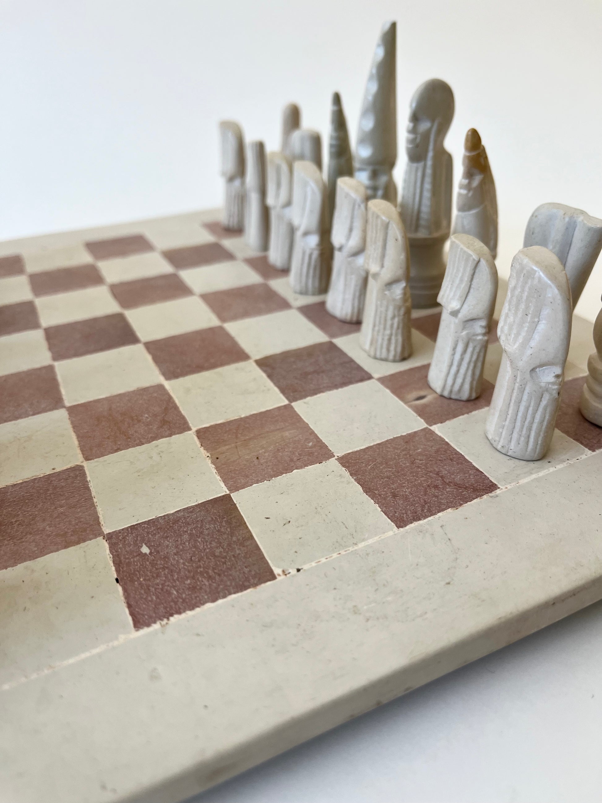 A carved stone chess set with sculptural, stylized figures in natural cream and terracotta tones. The abstract forms and hand-carved details give it a soulful, grounded presence. A fun conversation piece that doubles as functional art, equally at home styled on a coffee table or shelf.