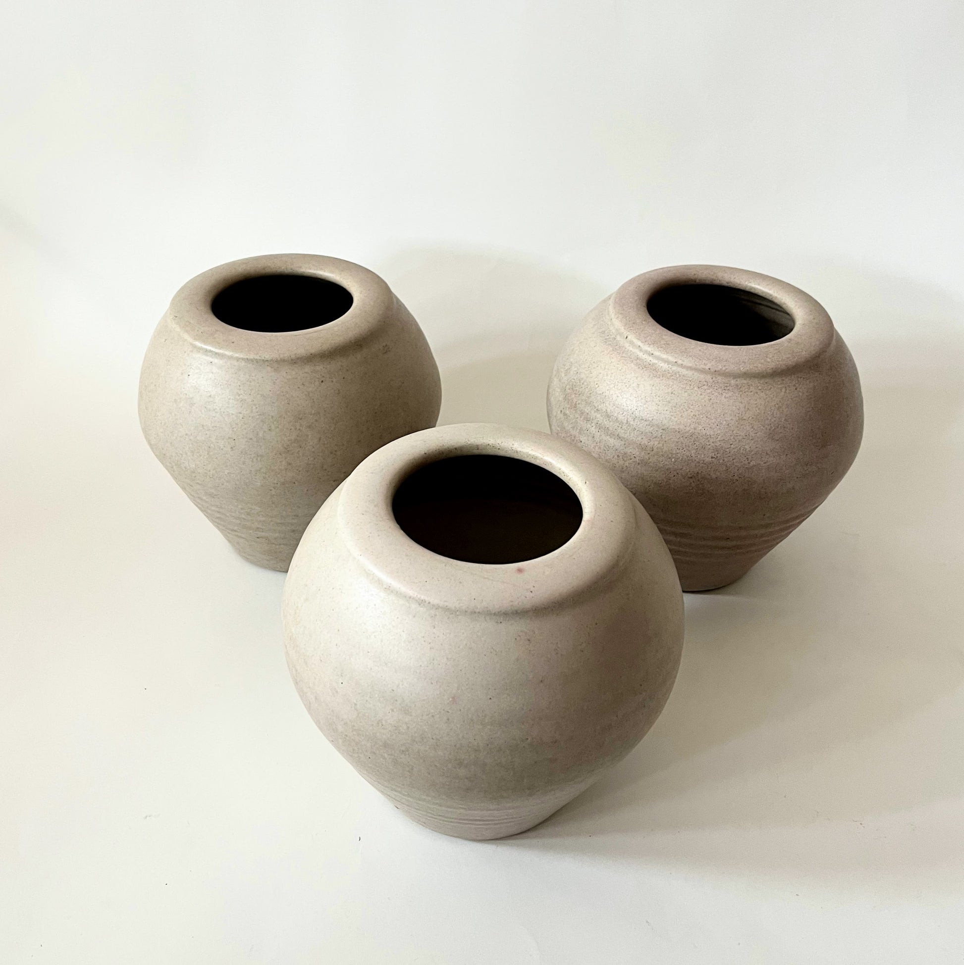 Hand-thrown in stoneware and finished in a soft greige glaze, with visible turning marks that highlight its artisanal quality. Signed "Mobach" on the base.