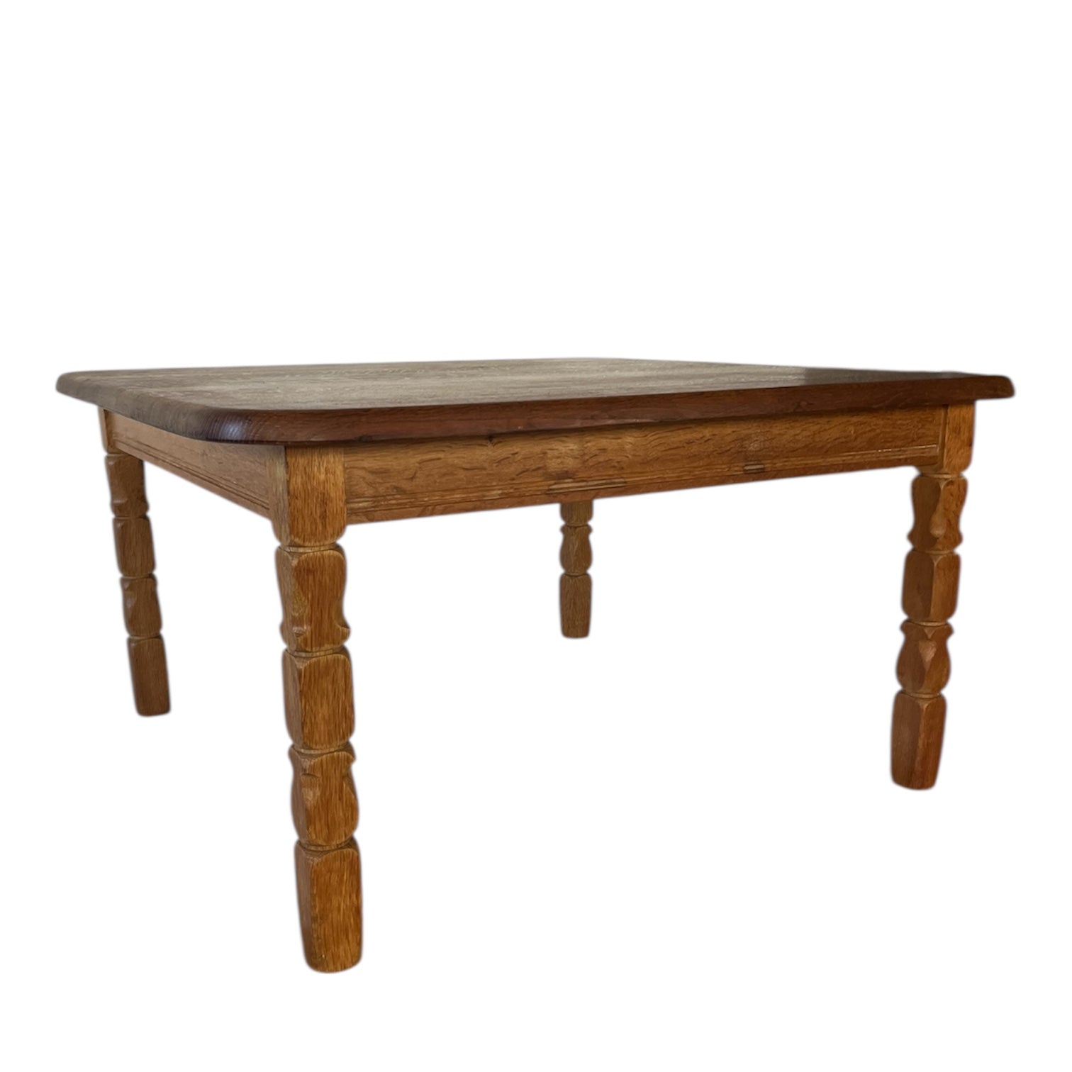 A sculptural Danish modern coffee table in the style of Henning Kjærnulf, dating to the 1960s. Crafted from solid oak, the table features softly rounded edges, expressive turned legs, and a beautifully aged patina that highlights the natural grain of the wood. The sturdy, architectural base is balanced by the gently contoured top, giving the piece both visual weight and warmth. A timeless, versatile table that layers effortlessly into both modern and traditional interiors.