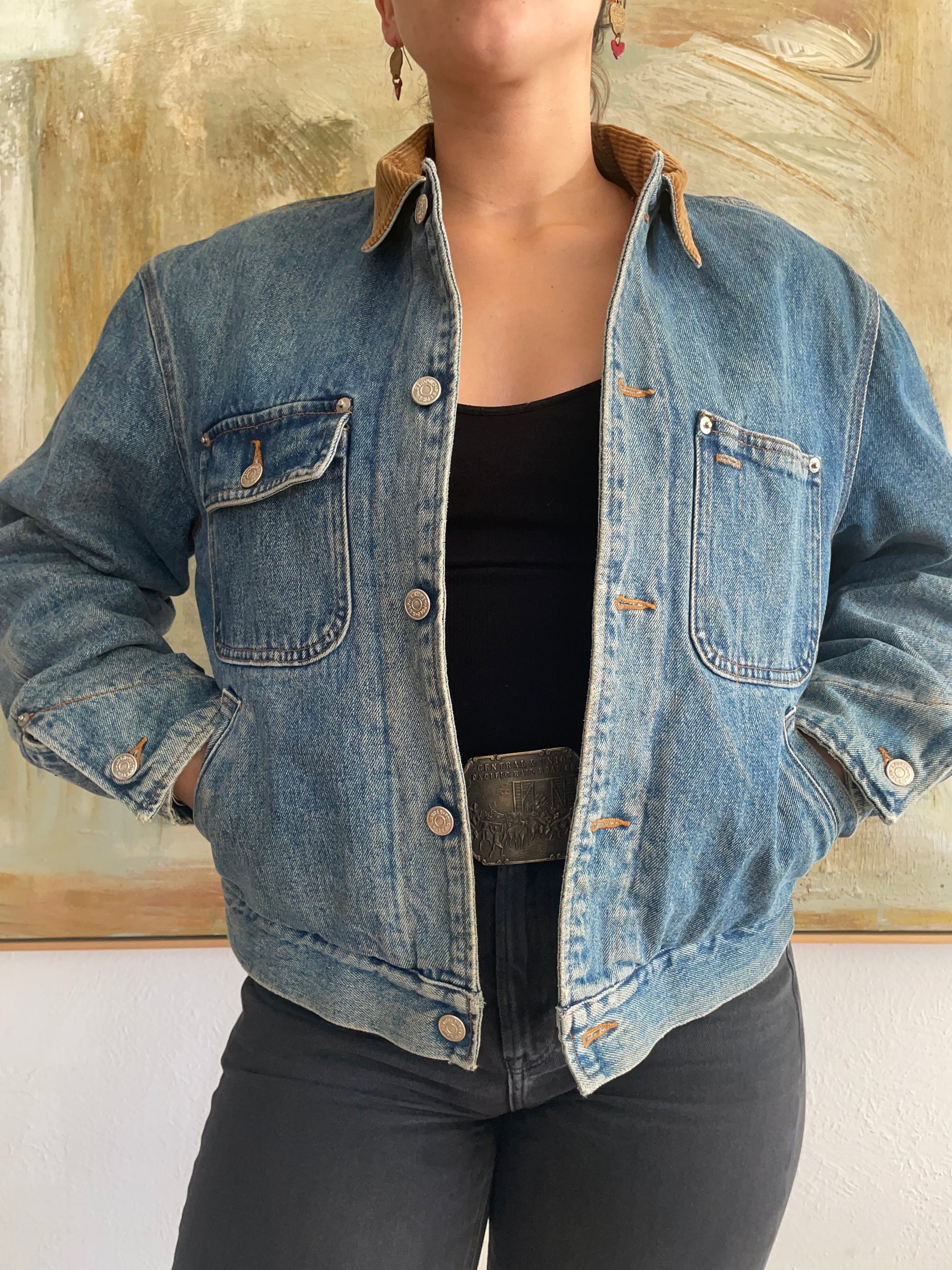 Lined with plaid and featuring a corduroy collar, this jacket is warm and perfect for layering.
