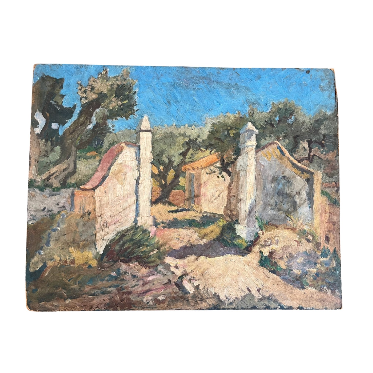 A painterly scene of a rustic garden entrance in southern France, this work captures the quiet beauty of everyday village life. Weathered stone gateposts and low stucco walls frame a sun-washed path, while clay tile roofs and mature trees hint at a warm Mediterranean climate. Loose, expressive brushstrokes and an earthy palette lend the piece an inviting, lived-in quality, evoking the timeless charm of the French countryside.
