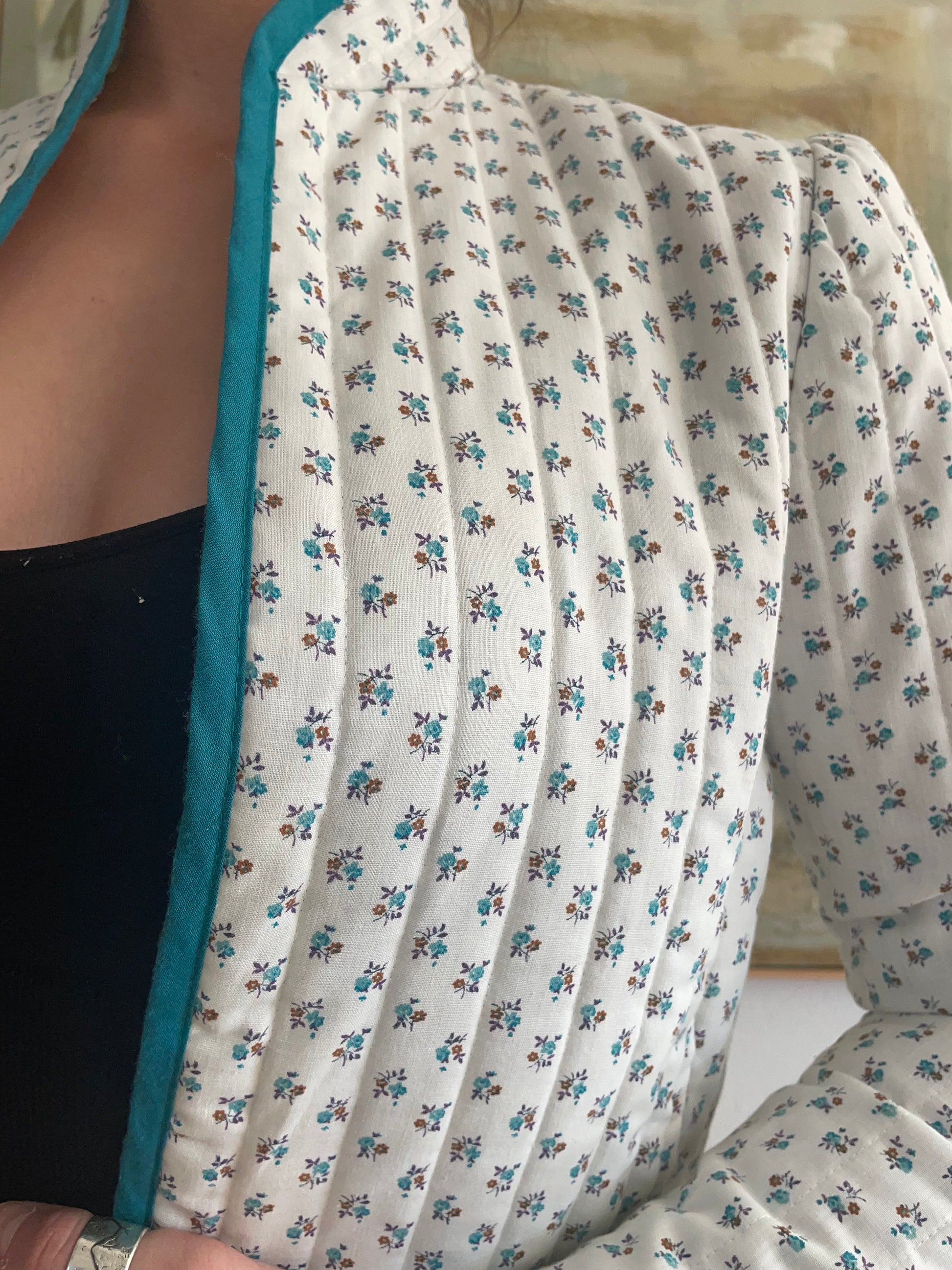 Sweet cropped quilt jacket features pockets on both the inside and outside of the piece.